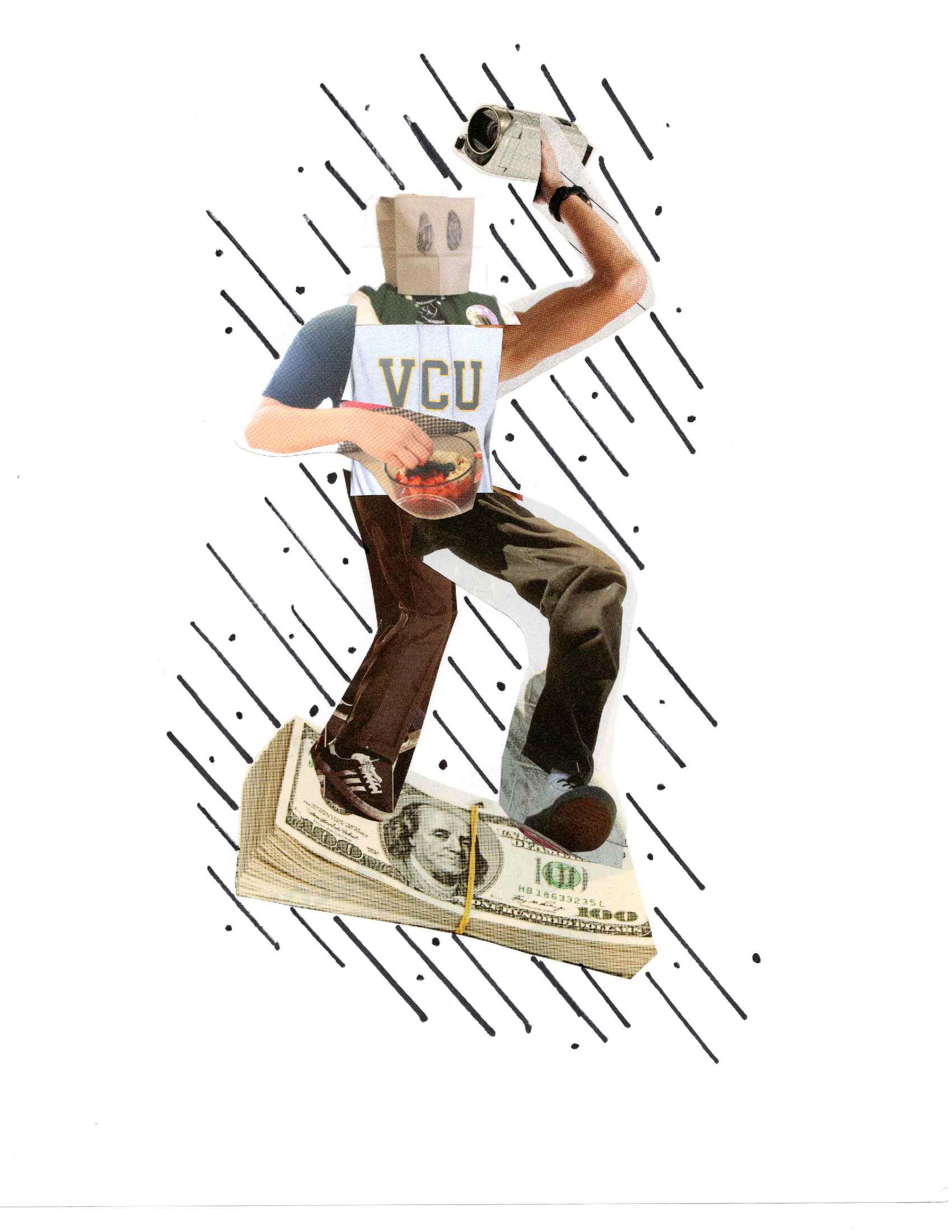 A scanned collage I made during a collage workshop in a class with VCU Graphic Design! A camcorder in one hand, an acai bowl(?) in the other, a bag on his head, and a VCU hoodie. All while on a skateboard, impressive! I have the same hoodie so him and I have something in common.